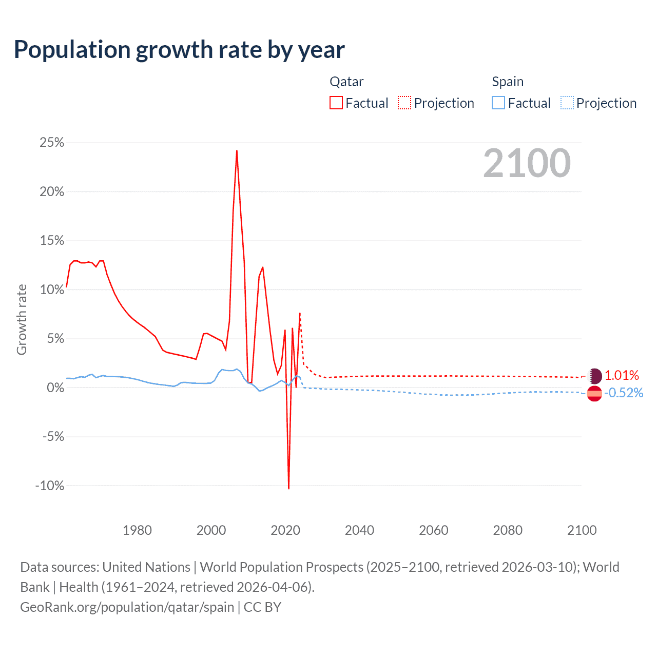 - For the last 10 years, Qatar has had an average growth rate of +3.86% per year vs +0.43% in Spain.