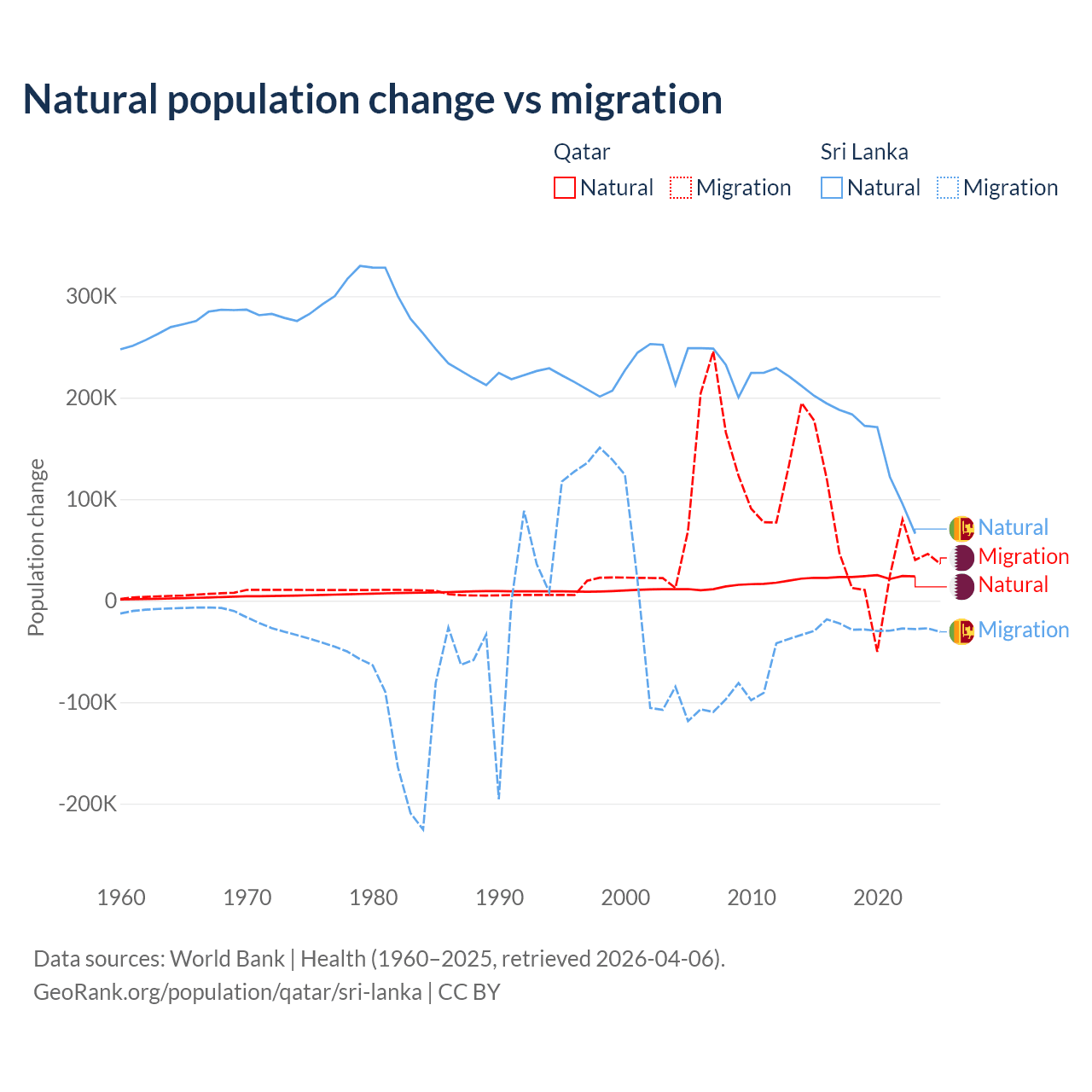 Over the last 10 years, 26.1% of the population change in Qatar is from natural causes (a gain of 232,009 people) and 73.9% is from migration (a gain of 655,712 people). In Sri Lanka 85.3% is from natural causes (a gain of 1,605,749 people) and 14.7% is from migration (a loss of 276,121 people).