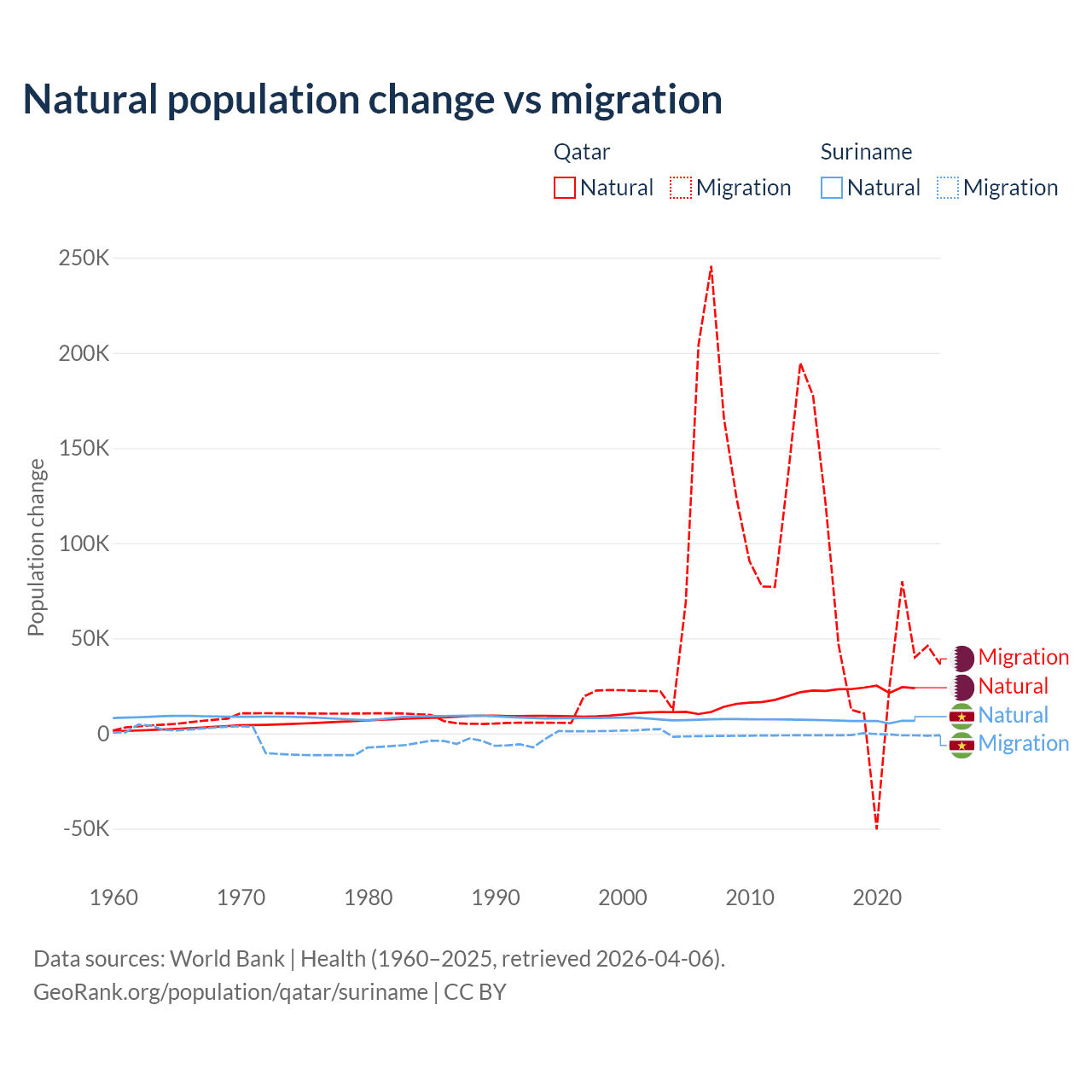 Over the last 10 years, 26.1% of the population change in Qatar is from natural causes (a gain of 232,009 people) and 73.9% is from migration (a gain of 655,712 people). In Suriname 90.3% is from natural causes (a gain of 66,709 people) and 9.72% is from migration (a loss of 7,185 people).