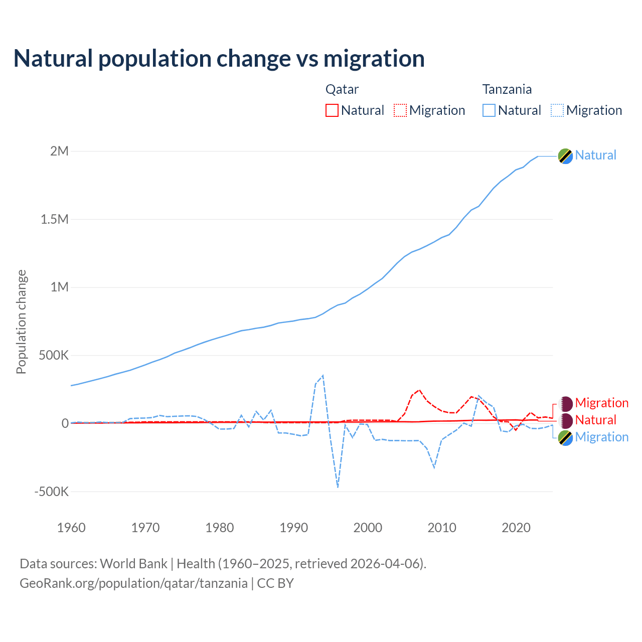 Over the last 10 years, 26.1% of the population change in Qatar is from natural causes (a gain of 232,009 people) and 73.9% is from migration (a gain of 655,712 people). In Tanzania 98.7% is from natural causes (a gain of 17,769,541 people) and 1.27% is from migration (a gain of 229,466 people).