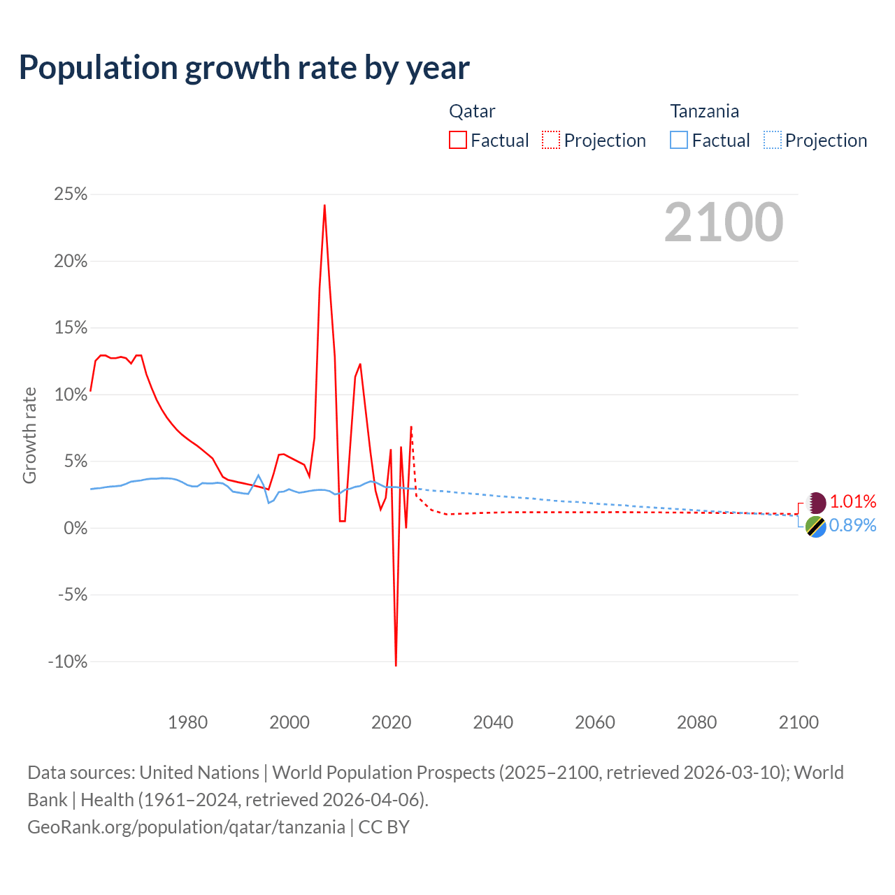 - For the last 10 years, Qatar has had an average growth rate of +3.86% per year vs +3.13% in Tanzania.