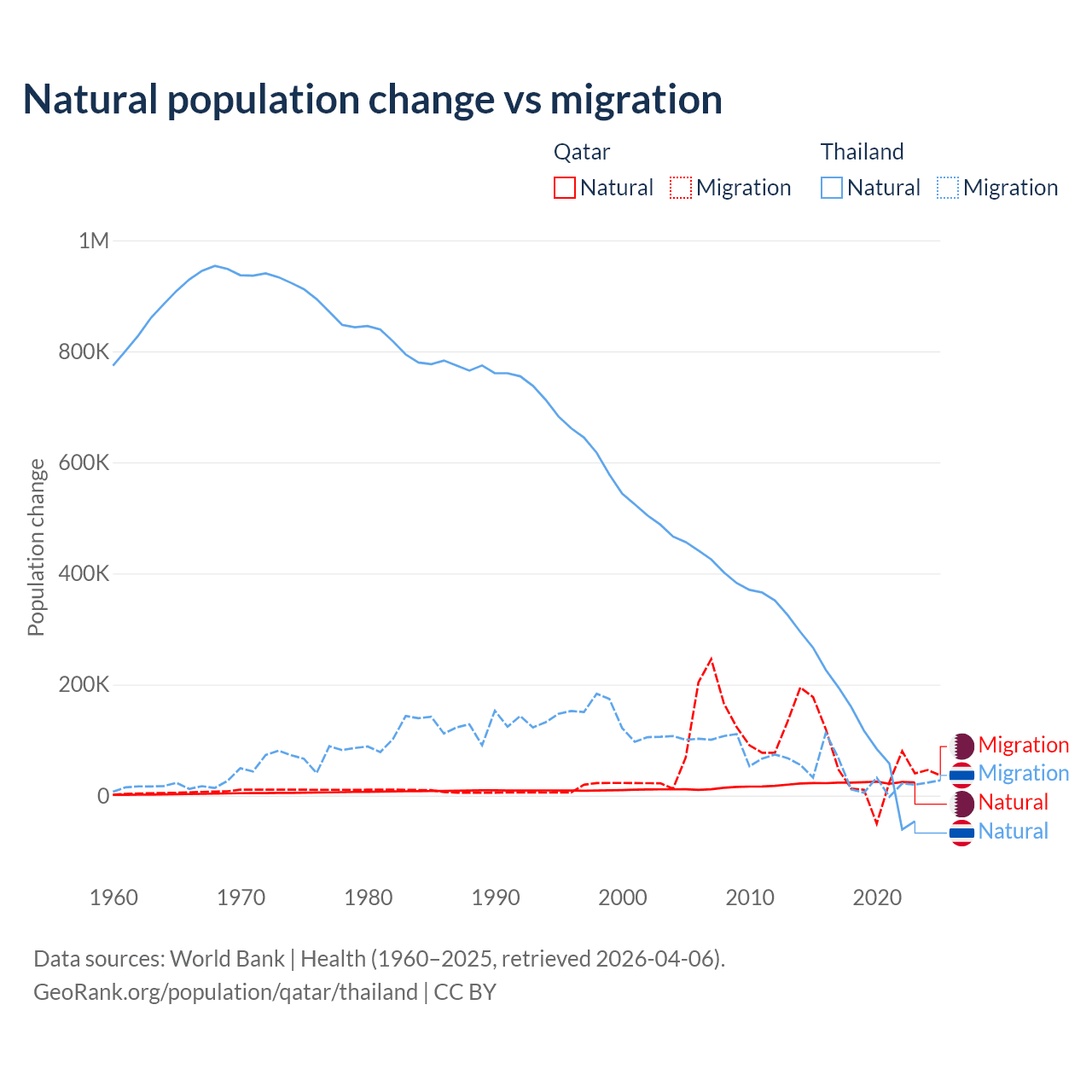 Over the last 10 years, 26.1% of the population change in Qatar is from natural causes (a gain of 232,009 people) and 73.9% is from migration (a gain of 655,712 people). In Thailand 78.4% is from natural causes (a gain of 1,292,528 people) and 21.6% is from migration (a gain of 355,361 people).