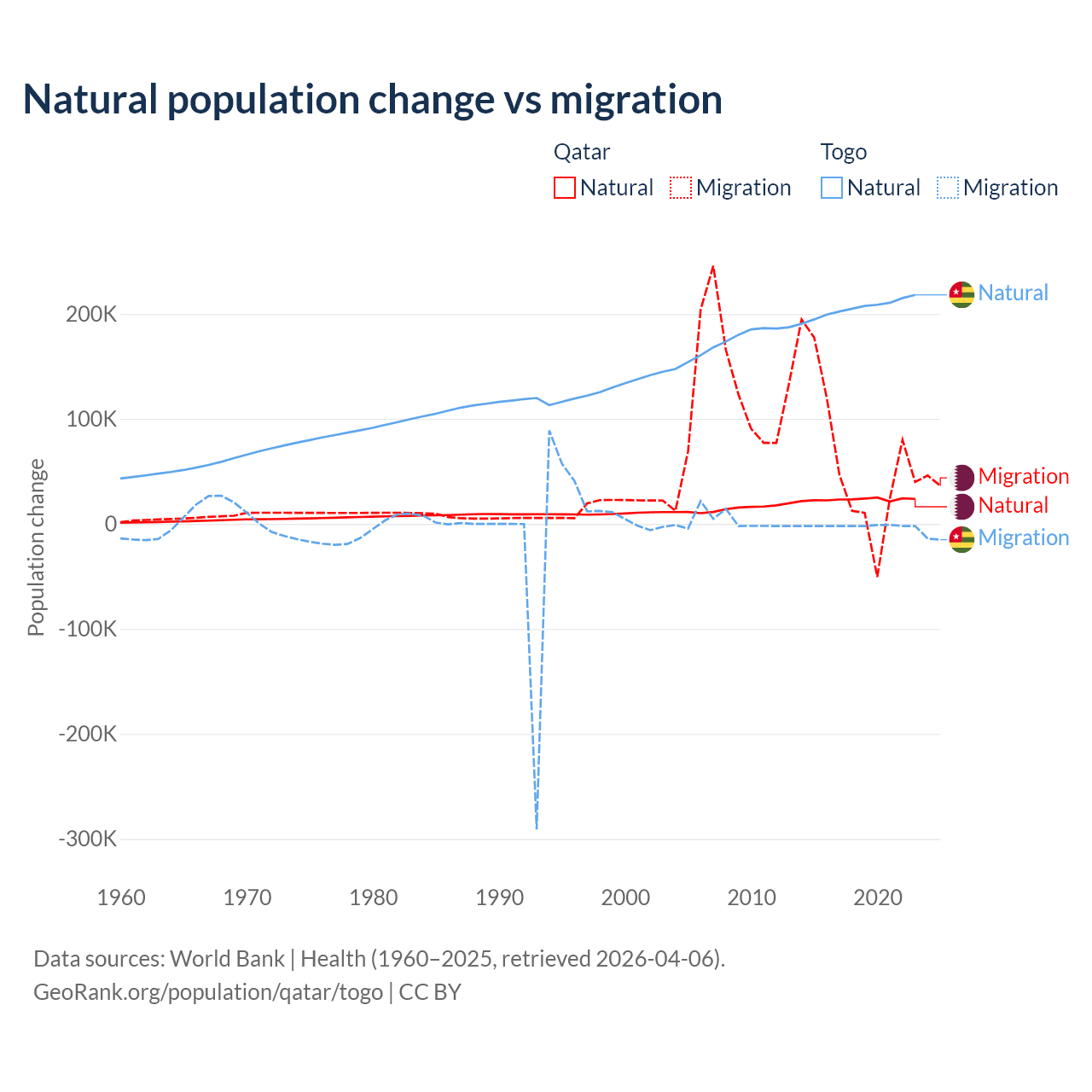 Over the last 10 years, 26.1% of the population change in Qatar is from natural causes (a gain of 232,009 people) and 73.9% is from migration (a gain of 655,712 people). In Togo 99.1% is from natural causes (a gain of 2,052,115 people) and 0.86% is from migration (a loss of 17,852 people).