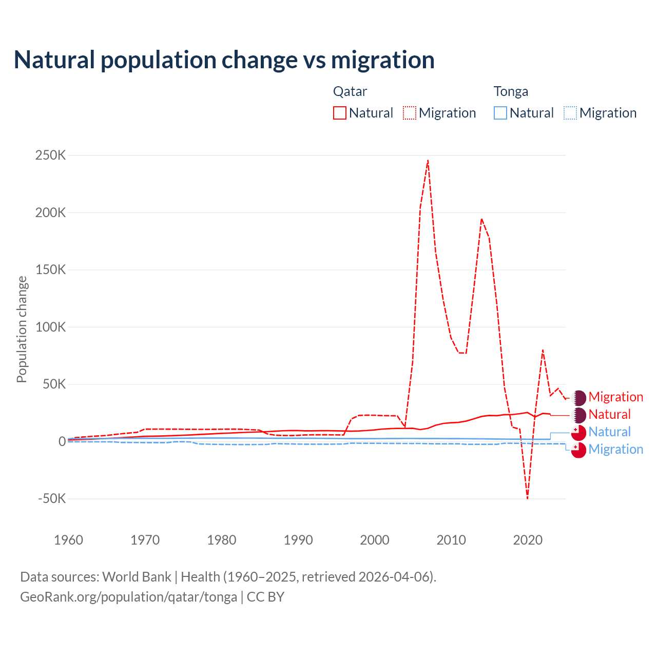 Over the last 10 years, 26.1% of the population change in Qatar is from natural causes (a gain of 232,009 people) and 73.9% is from migration (a gain of 655,712 people). In Tonga 46.9% is from natural causes (a gain of 18,919 people) and 53.1% is from migration (a loss of 21,384 people).