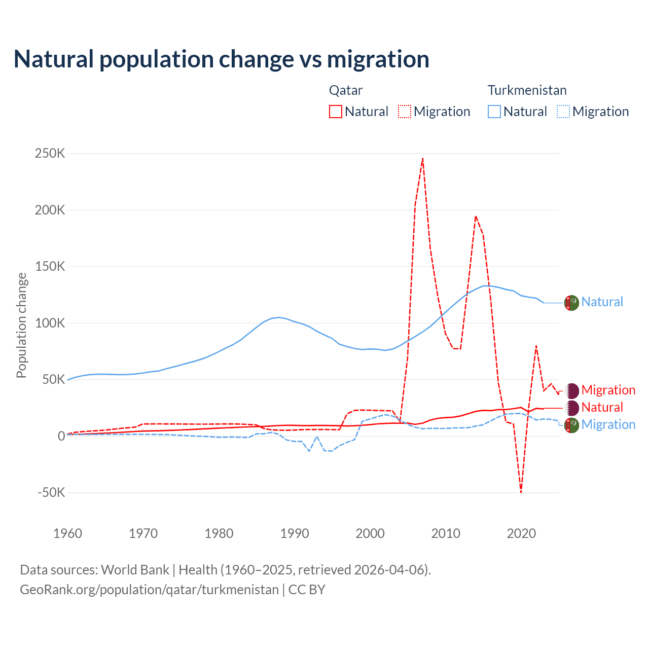 Over the last 10 years, 26.1% of the population change in Qatar is from natural causes (a gain of 232,009 people) and 73.9% is from migration (a gain of 655,712 people). In Turkmenistan 89.2% is from natural causes (a gain of 1,270,228 people) and 10.8% is from migration (a gain of 154,379 people).