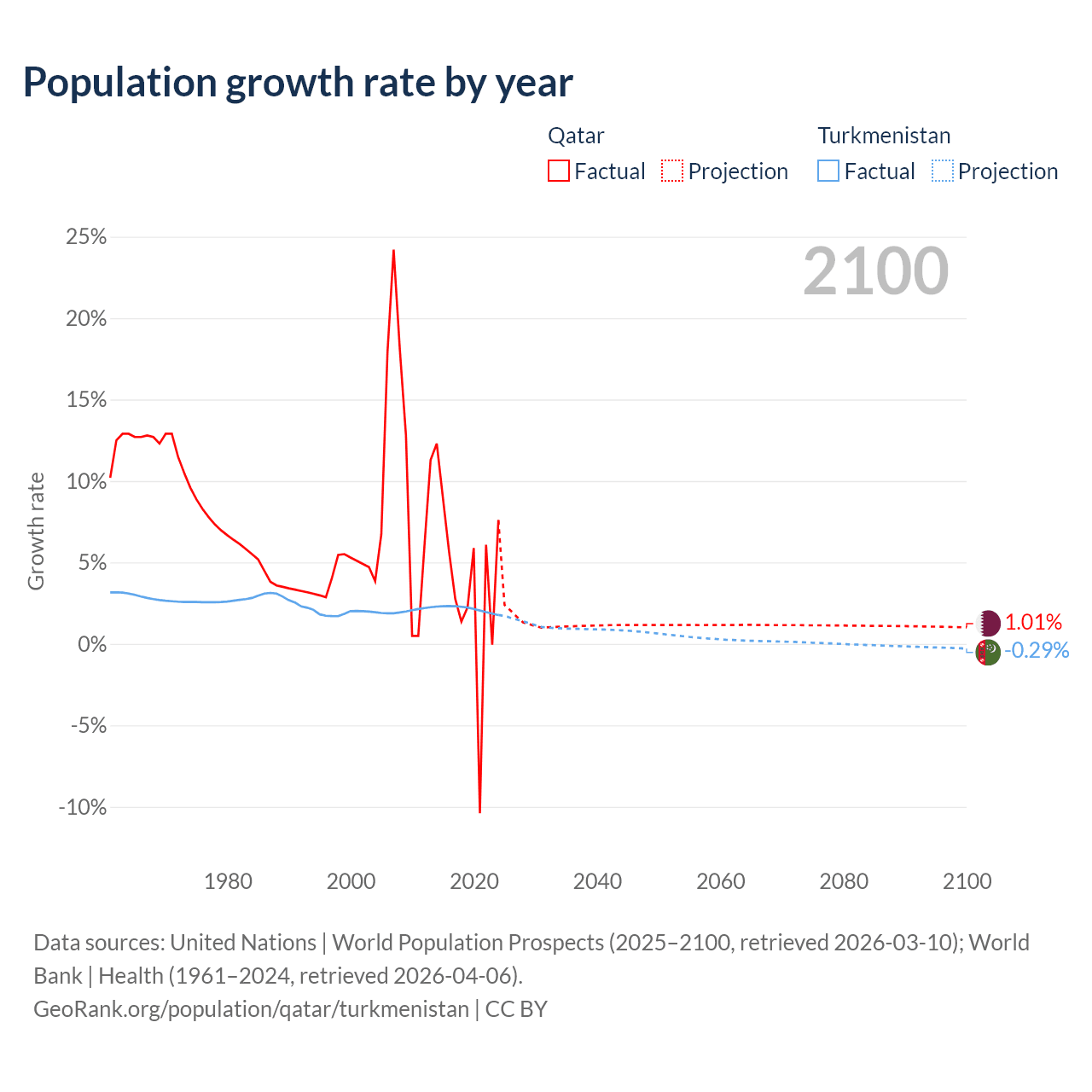 - For the last 10 years, Qatar has had an average growth rate of +3.86% per year vs +2.14% in Turkmenistan.