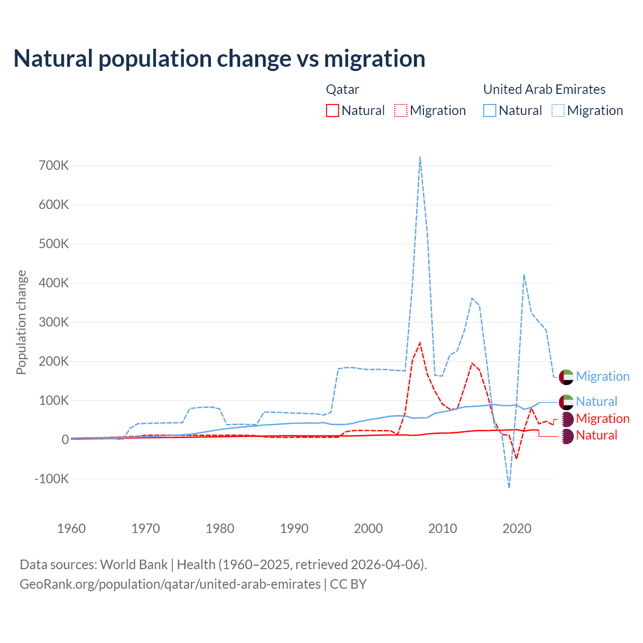 Over the last 10 years, 26.1% of the population change in Qatar is from natural causes (a gain of 232,009 people) and 73.9% is from migration (a gain of 655,712 people). In the United Arab Emirates 30.5% is from natural causes (a gain of 857,996 people) and 69.5% is from migration (a gain of 1,958,520 people).