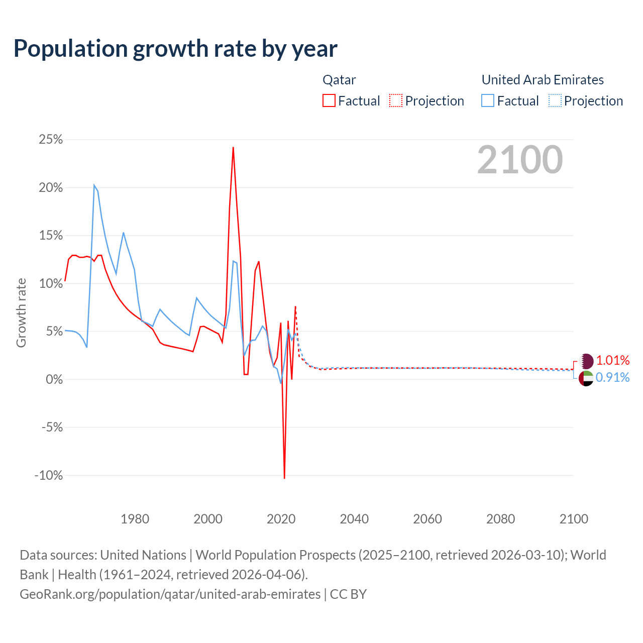 - For the last 10 years, Qatar has had an average growth rate of +3.86% per year vs +3.31% in the United Arab Emirates.