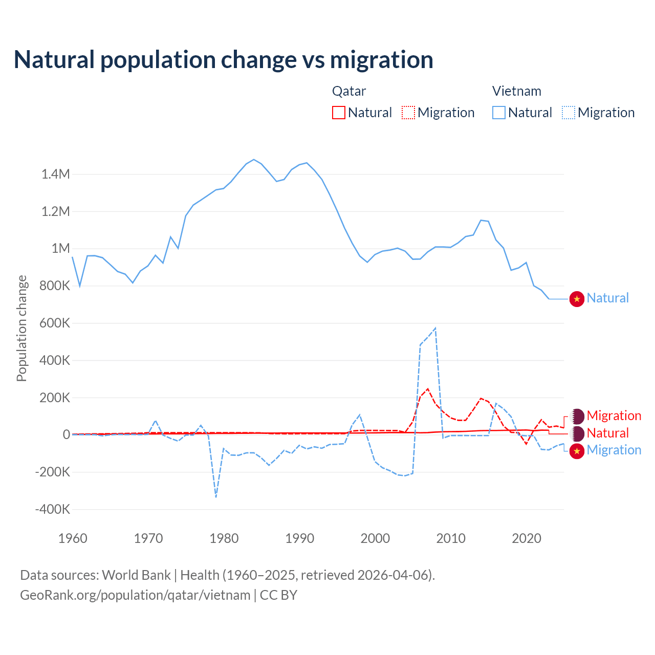 Over the last 10 years, 26.1% of the population change in Qatar is from natural causes (a gain of 232,009 people) and 73.9% is from migration (a gain of 655,712 people). In Vietnam 97.7% is from natural causes (a gain of 9,349,756 people) and 2.29% is from migration (a gain of 219,073 people).