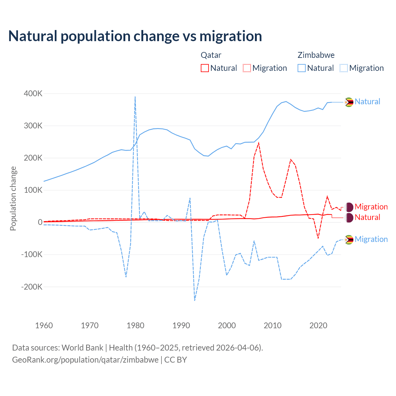 Over the last 10 years, 26.1% of the population change in Qatar is from natural causes (a gain of 232,009 people) and 73.9% is from migration (a gain of 655,712 people). In Zimbabwe 74.9% is from natural causes (a gain of 3,558,487 people) and 25.1% is from migration (a loss of 1,192,807 people).