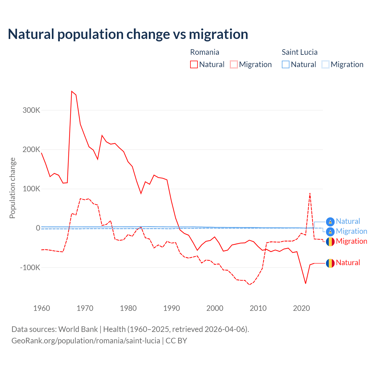 Over the last 10 years, 82% of the population change in Romania is from natural causes (a loss of 766,295 people) and 18% is from migration (a loss of 167,917 people). In Saint Lucia 95.7% is from natural causes (a gain of 6,039 people) and 4.31% is from migration (a loss of 272 people).