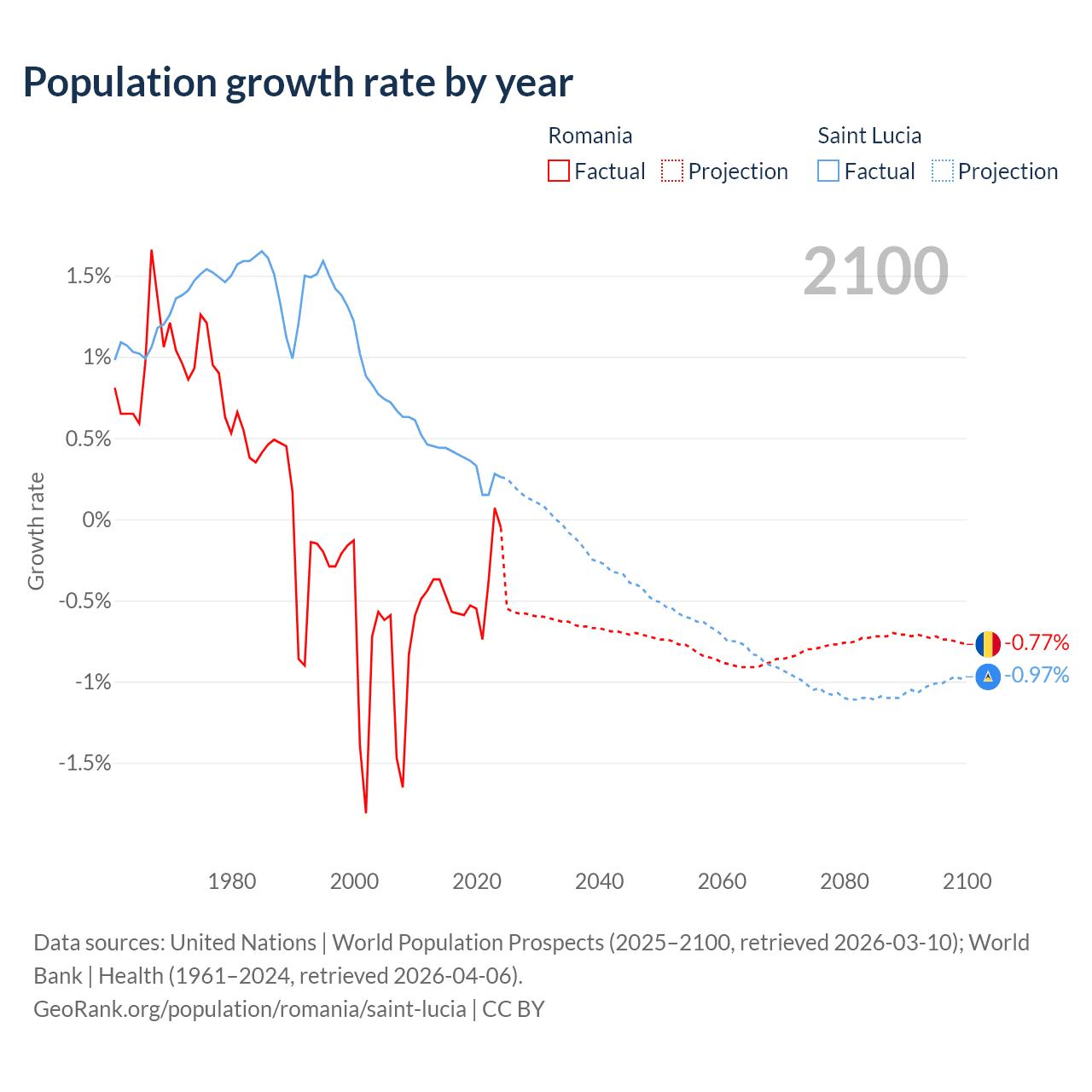 - For the last 10 years, Romania has had an average growth rate of -0.43% per year vs +0.33% in Saint Lucia.