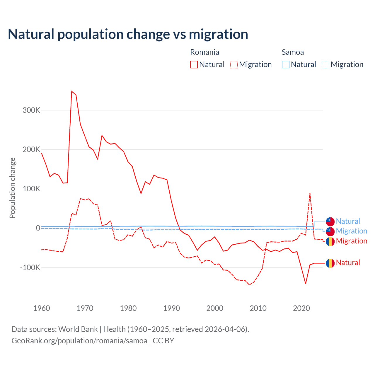 Over the last 10 years, 82% of the population change in Romania is from natural causes (a loss of 766,295 people) and 18% is from migration (a loss of 167,917 people). In Samoa 62.5% is from natural causes (a gain of 45,436 people) and 37.5% is from migration (a loss of 27,246 people).