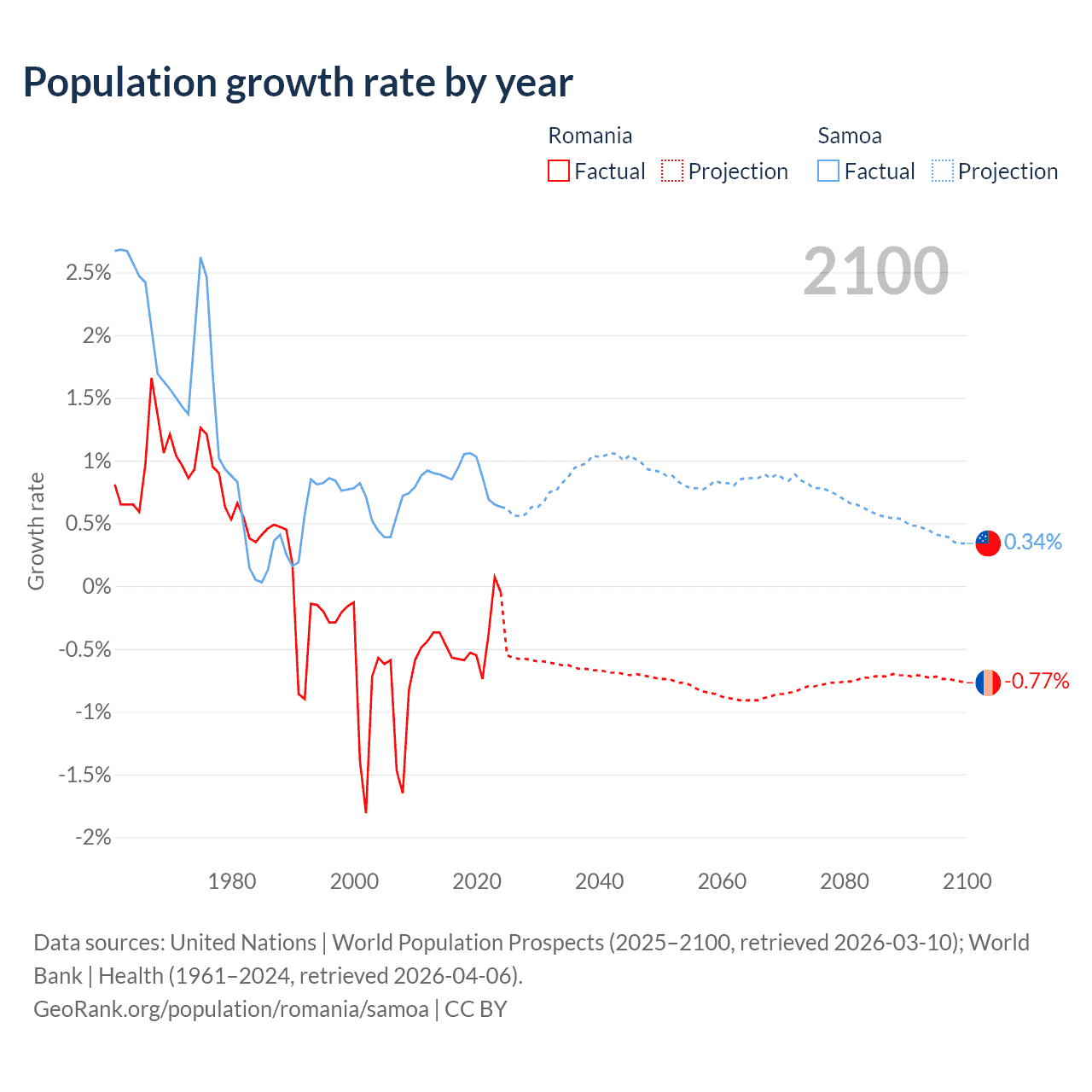 - For the last 10 years, Romania has had an average growth rate of -0.43% per year vs +0.87% in Samoa.