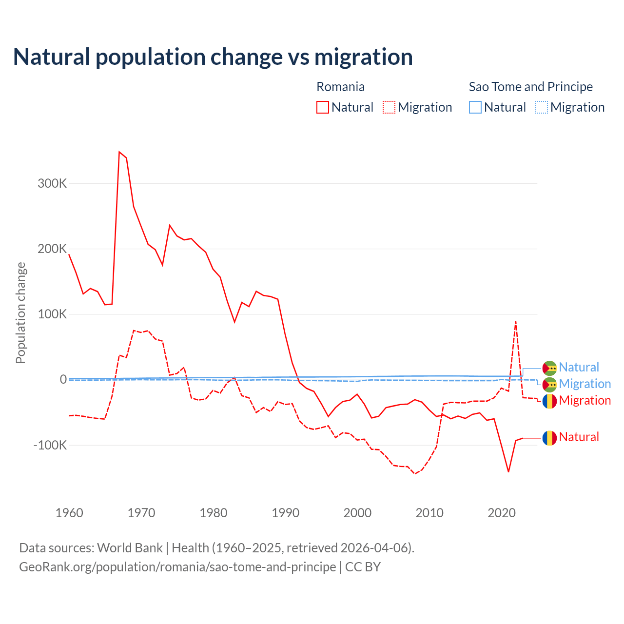 Over the last 10 years, 82% of the population change in Romania is from natural causes (a loss of 766,295 people) and 18% is from migration (a loss of 167,917 people). In Sao Tome and Principe 80.1% is from natural causes (a gain of 50,822 people) and 19.9% is from migration (a loss of 12,621 people).