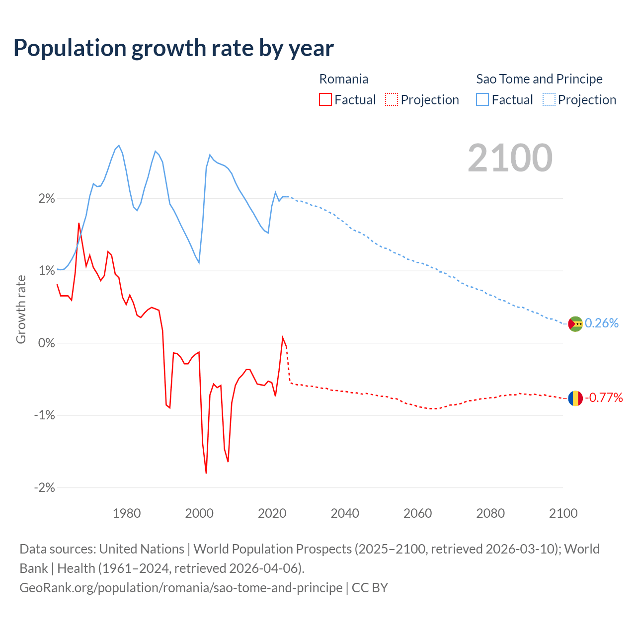 - For the last 10 years, Romania has had an average growth rate of -0.43% per year vs +1.82% in Sao Tome and Principe.