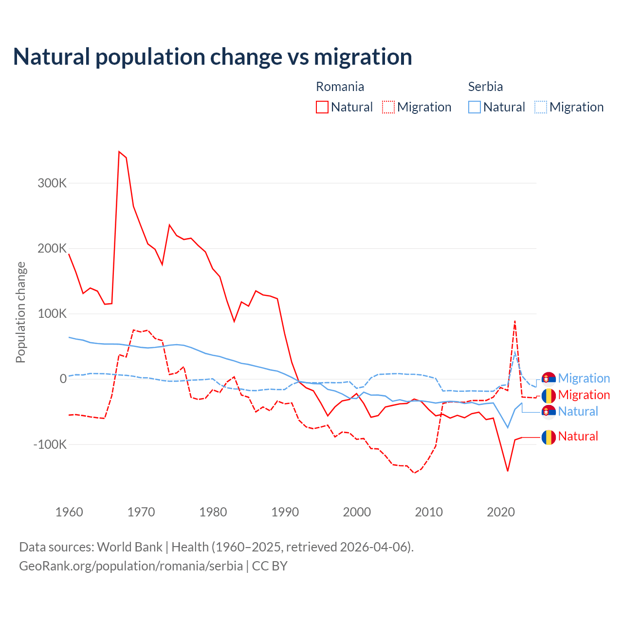Over the last 10 years, 82% of the population change in Romania is from natural causes (a loss of 766,295 people) and 18% is from migration (a loss of 167,917 people). In Serbia 83.3% is from natural causes (a loss of 435,148 people) and 16.7% is from migration (a loss of 87,110 people).