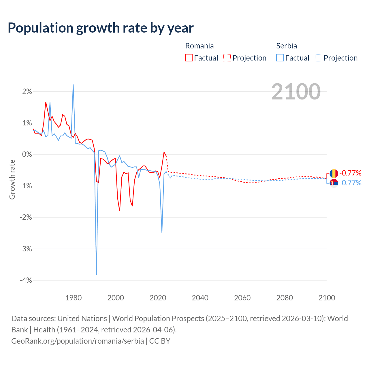 - For the last 10 years, Romania has had an average growth rate of -0.43% per year vs -0.76% in Serbia.