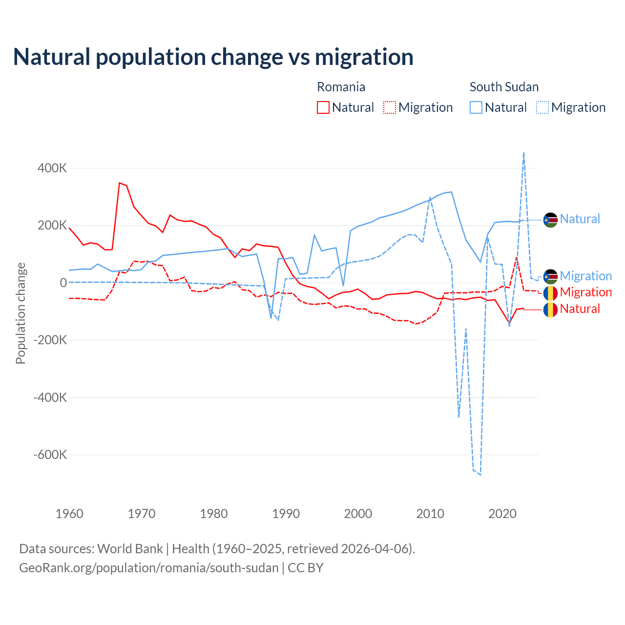 Over the last 10 years, 82% of the population change in Romania is from natural causes (a loss of 766,295 people) and 18% is from migration (a loss of 167,917 people). In South Sudan 57.4% is from natural causes (a gain of 1,792,135 people) and 42.6% is from migration (a loss of 1,329,606 people).