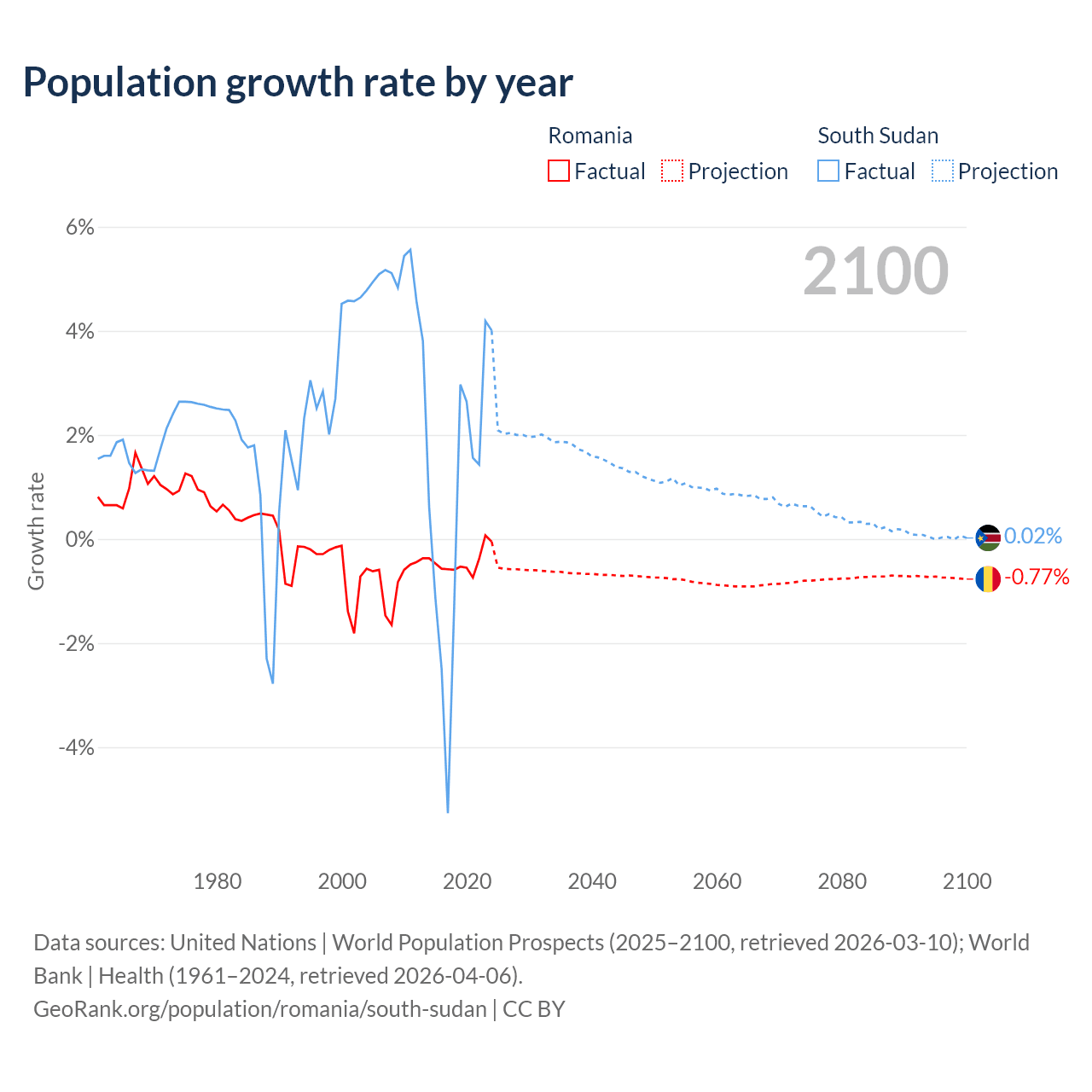 - For the last 10 years, Romania has had an average growth rate of -0.43% per year vs +0.65% in South Sudan.