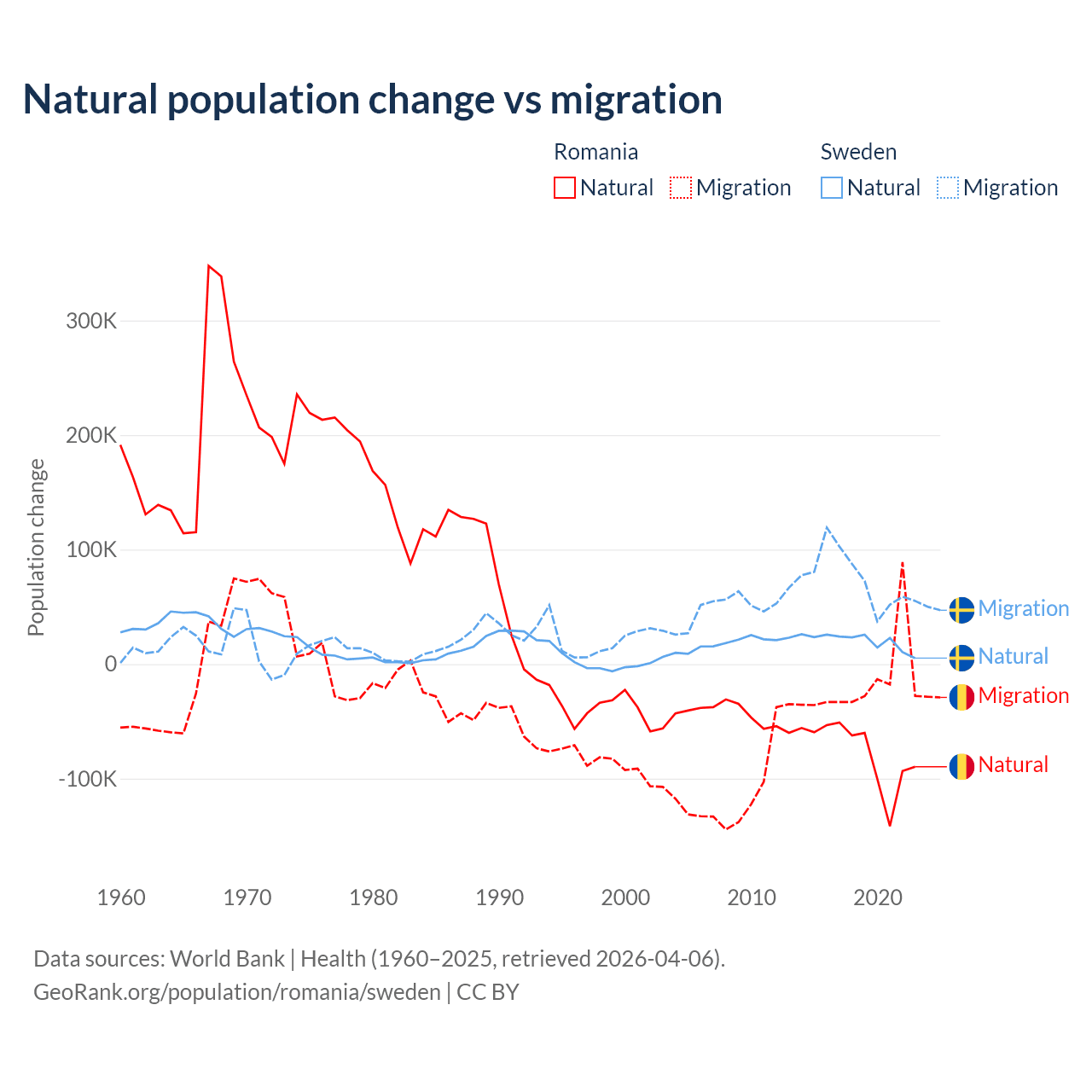 Over the last 10 years, 82% of the population change in Romania is from natural causes (a loss of 766,295 people) and 18% is from migration (a loss of 167,917 people). In Sweden 21.4% is from natural causes (a gain of 201,900 people) and 78.6% is from migration (a gain of 743,642 people).