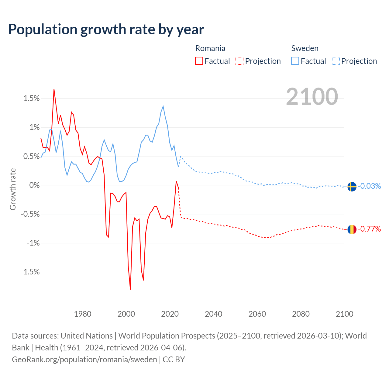 - For the last 10 years, Romania has had an average growth rate of -0.43% per year vs +0.88% in Sweden.