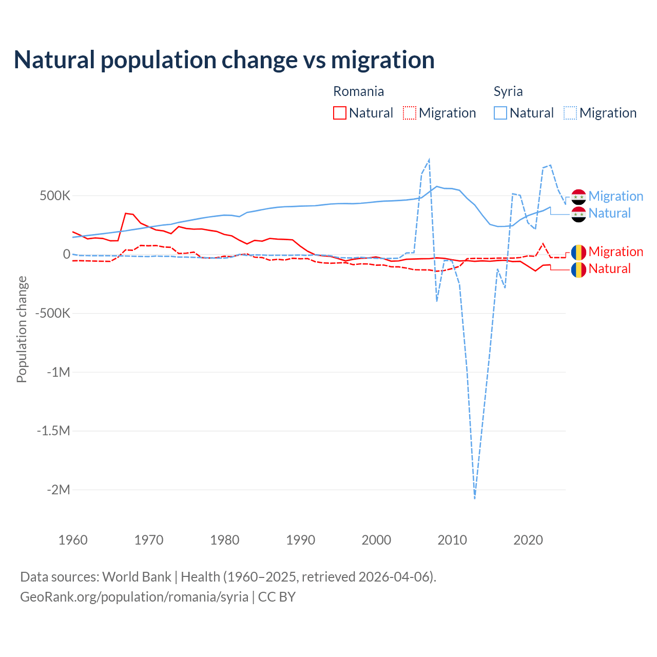 Over the last 10 years, 82% of the population change in Romania is from natural causes (a loss of 766,295 people) and 18% is from migration (a loss of 167,917 people). In Syria 91.3% is from natural causes (a gain of 3,047,621 people) and 8.72% is from migration (a gain of 291,069 people).