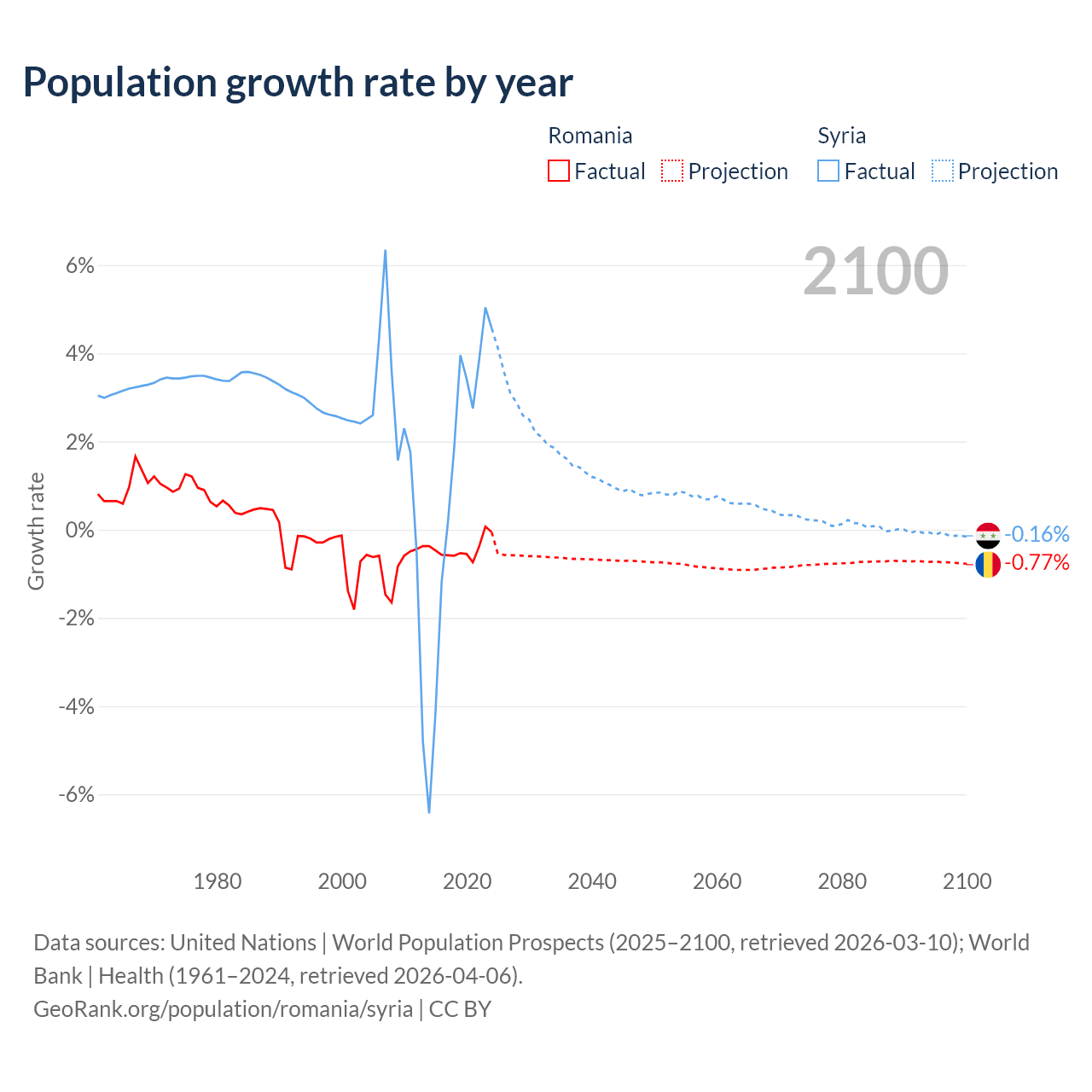 - For the last 10 years, Romania has had an average growth rate of -0.43% per year vs +1.25% in Syria.