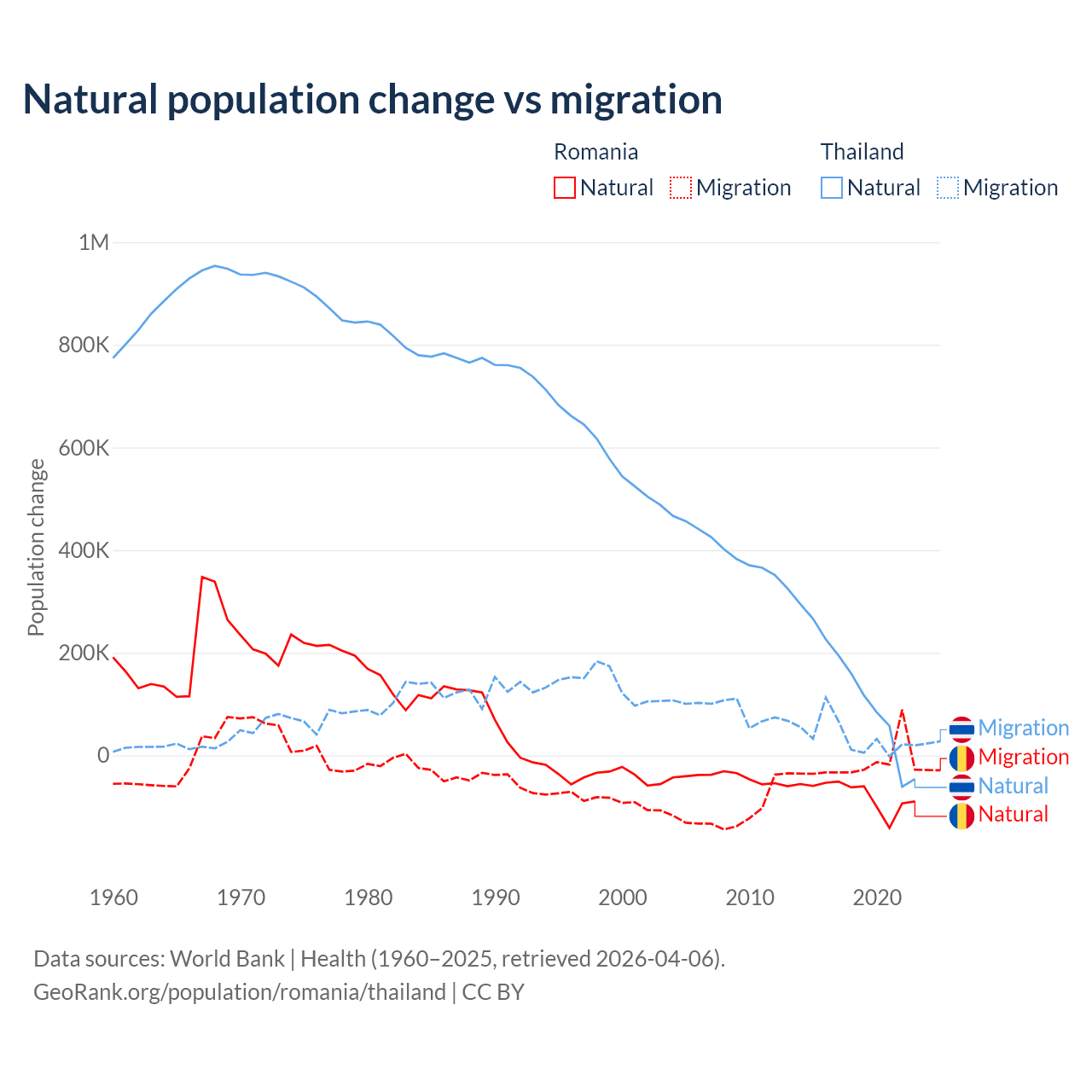 Over the last 10 years, 82% of the population change in Romania is from natural causes (a loss of 766,295 people) and 18% is from migration (a loss of 167,917 people). In Thailand 78.4% is from natural causes (a gain of 1,292,528 people) and 21.6% is from migration (a gain of 355,361 people).