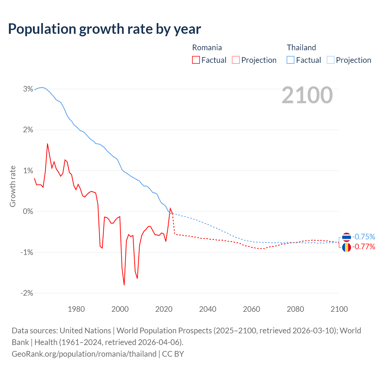 - For the last 10 years, Romania has had an average growth rate of -0.43% per year vs +0.23% in Thailand.