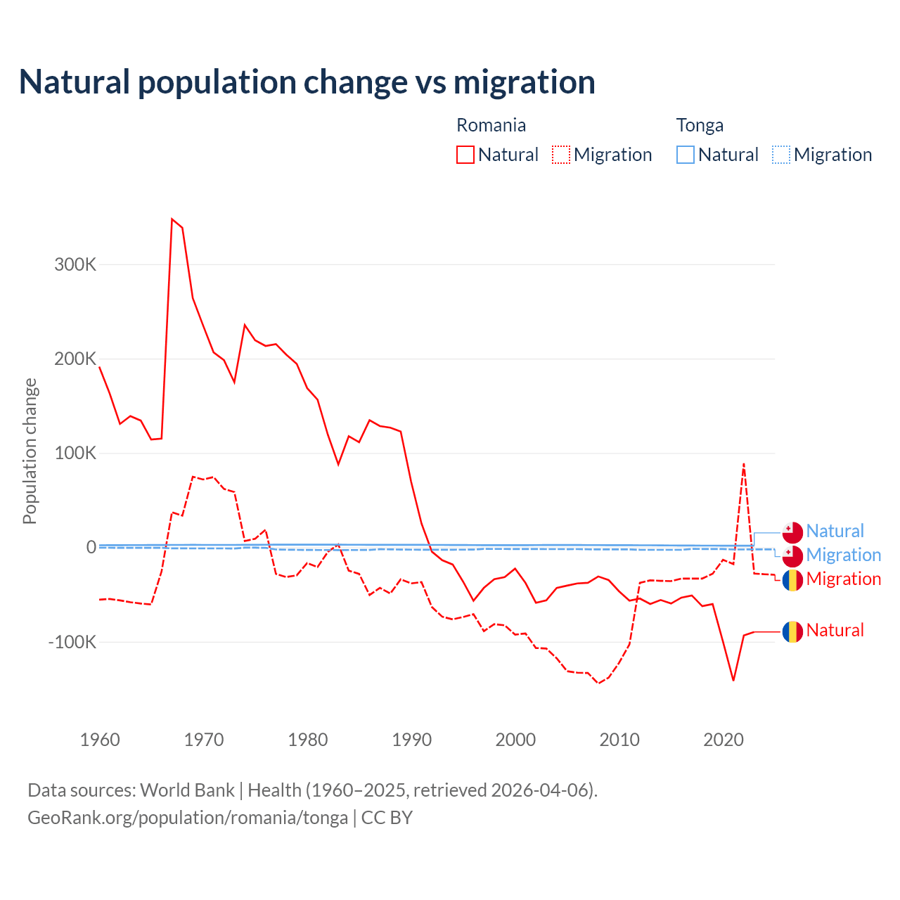 Over the last 10 years, 82% of the population change in Romania is from natural causes (a loss of 766,295 people) and 18% is from migration (a loss of 167,917 people). In Tonga 46.9% is from natural causes (a gain of 18,919 people) and 53.1% is from migration (a loss of 21,384 people).