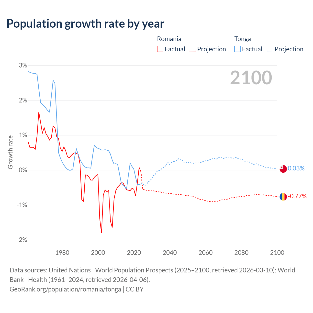 - For the last 10 years, Romania has had an average growth rate of -0.43% per year vs -0.25% in Tonga.