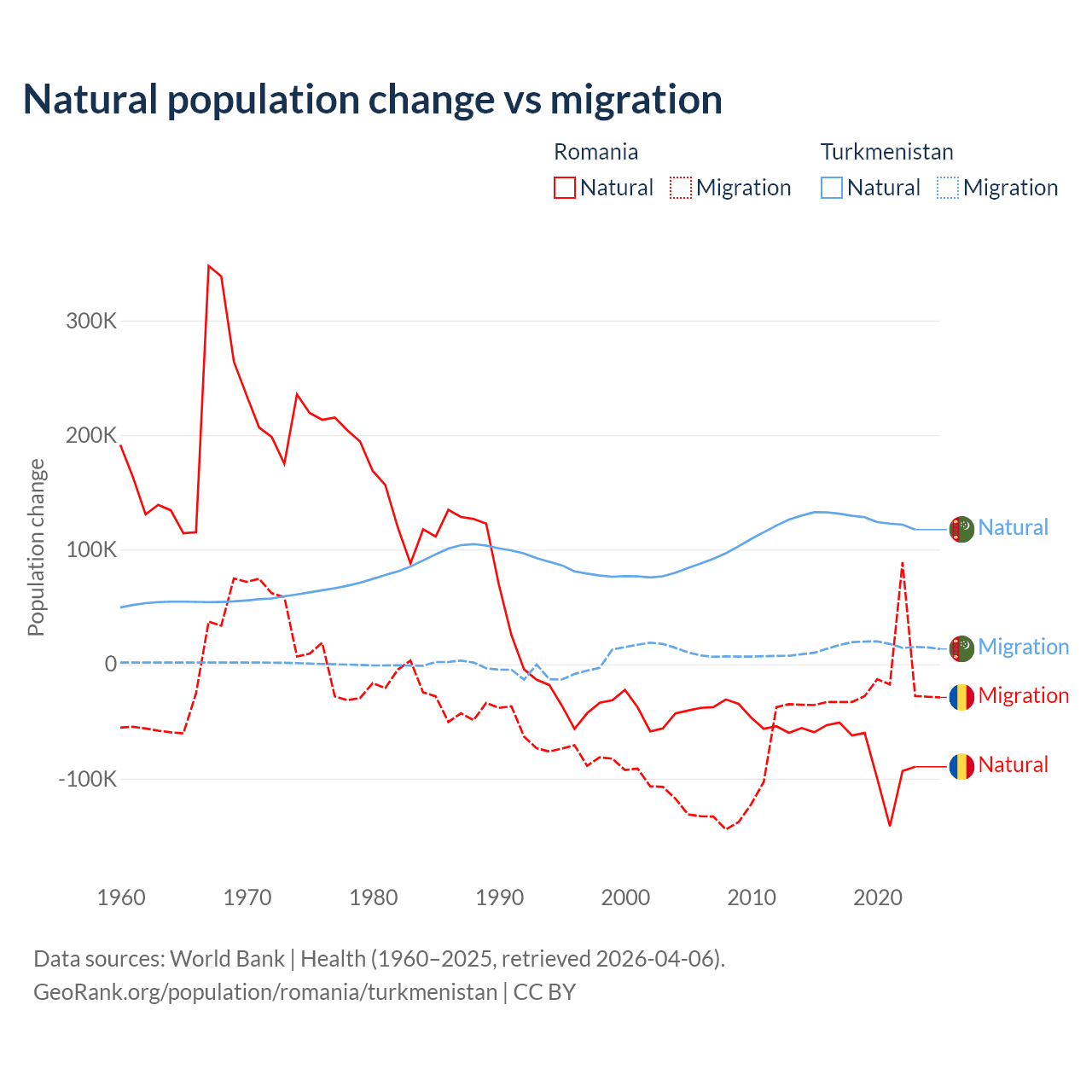 Over the last 10 years, 82% of the population change in Romania is from natural causes (a loss of 766,295 people) and 18% is from migration (a loss of 167,917 people). In Turkmenistan 89.2% is from natural causes (a gain of 1,270,228 people) and 10.8% is from migration (a gain of 154,379 people).
