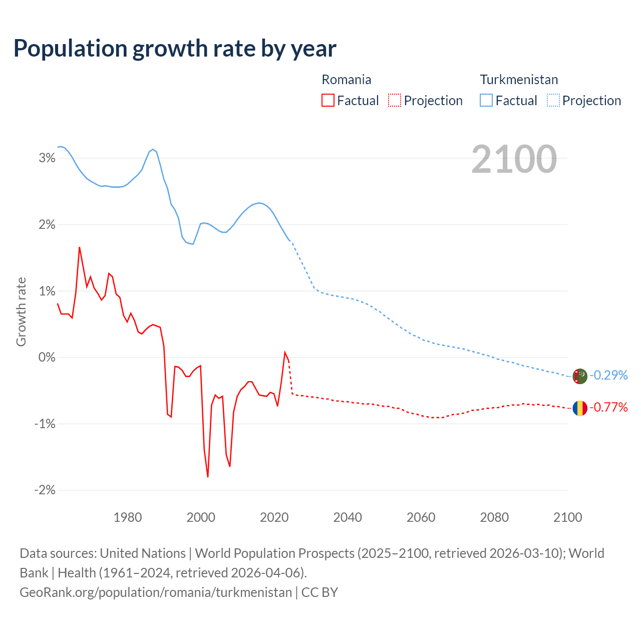 - For the last 10 years, Romania has had an average growth rate of -0.43% per year vs +2.14% in Turkmenistan.