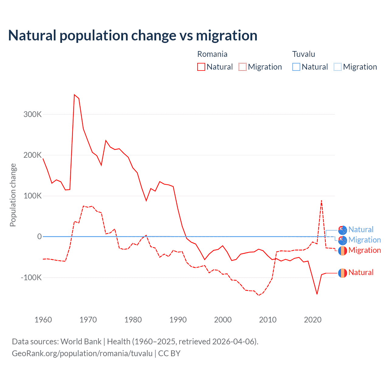 Over the last 10 years, 82% of the population change in Romania is from natural causes (a loss of 766,295 people) and 18% is from migration (a loss of 167,917 people). In Tuvalu 35.5% is from natural causes (a gain of 1,556 people) and 64.5% is from migration (a loss of 2,827 people).