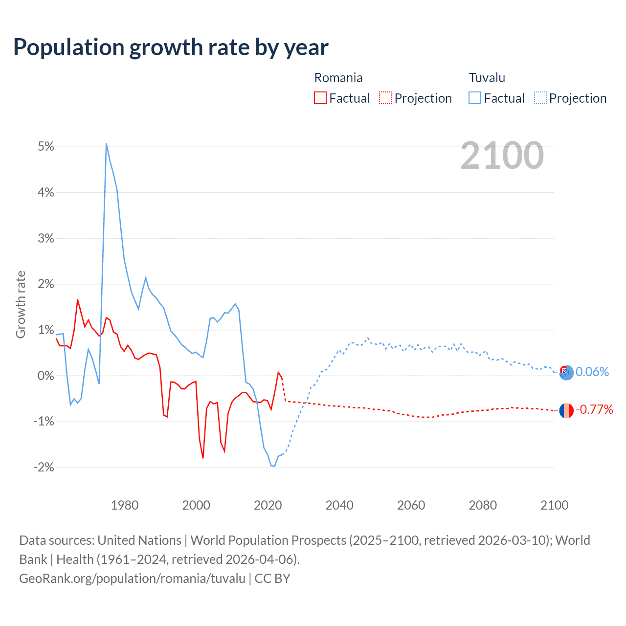 - For the last 10 years, Romania has had an average growth rate of -0.43% per year vs -1.19% in Tuvalu.