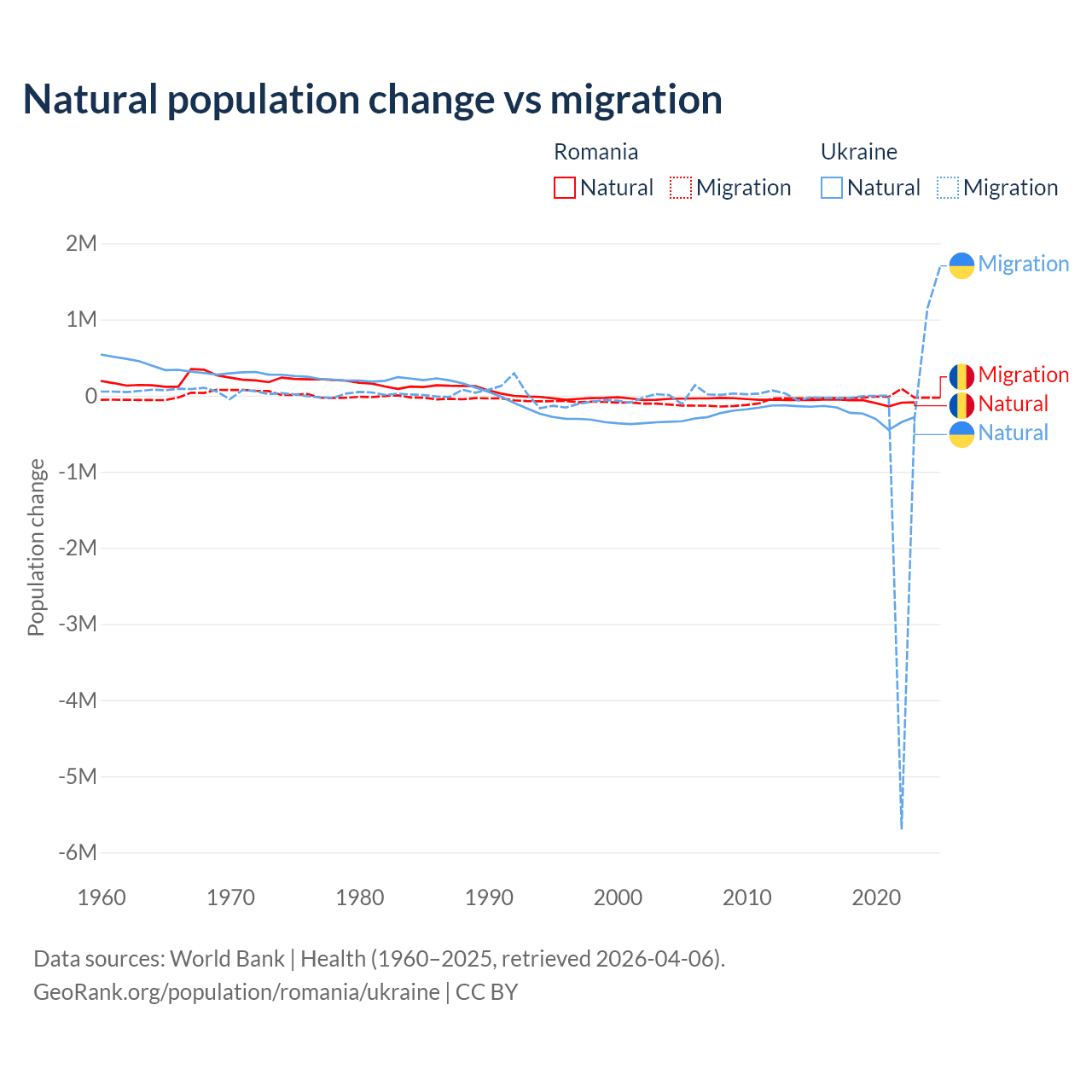 Over the last 10 years, 82% of the population change in Romania is from natural causes (a loss of 766,295 people) and 18% is from migration (a loss of 167,917 people). In Ukraine 28.2% is from natural causes (a loss of 2,435,153 people) and 71.8% is from migration (a loss of 6,198,995 people).