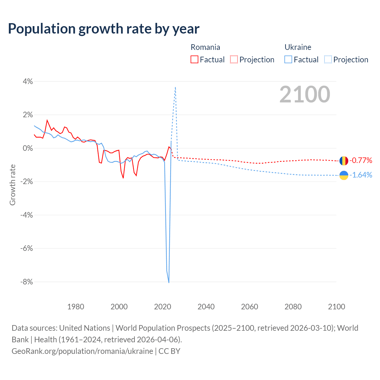 - For the last 10 years, Romania has had an average growth rate of -0.43% per year vs -1.74% in Ukraine.