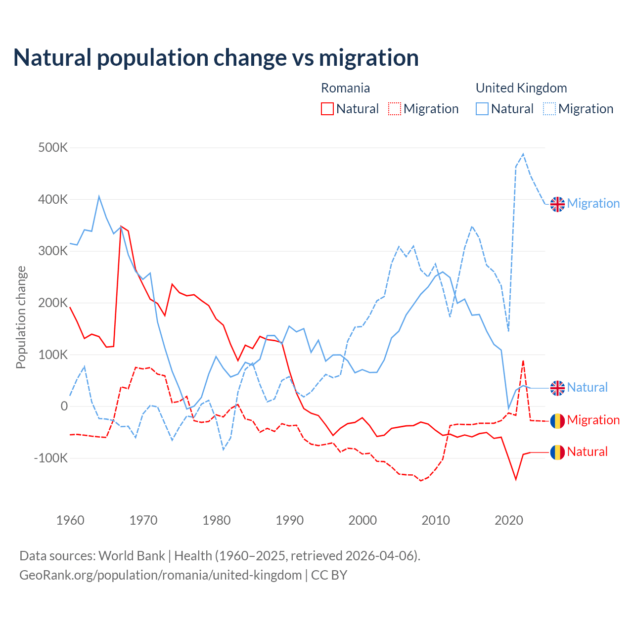 Over the last 10 years, 82% of the population change in Romania is from natural causes (a loss of 766,295 people) and 18% is from migration (a loss of 167,917 people). In the United Kingdom 23.9% is from natural causes (a gain of 1,033,129 people) and 76.1% is from migration (a gain of 3,283,101 people).