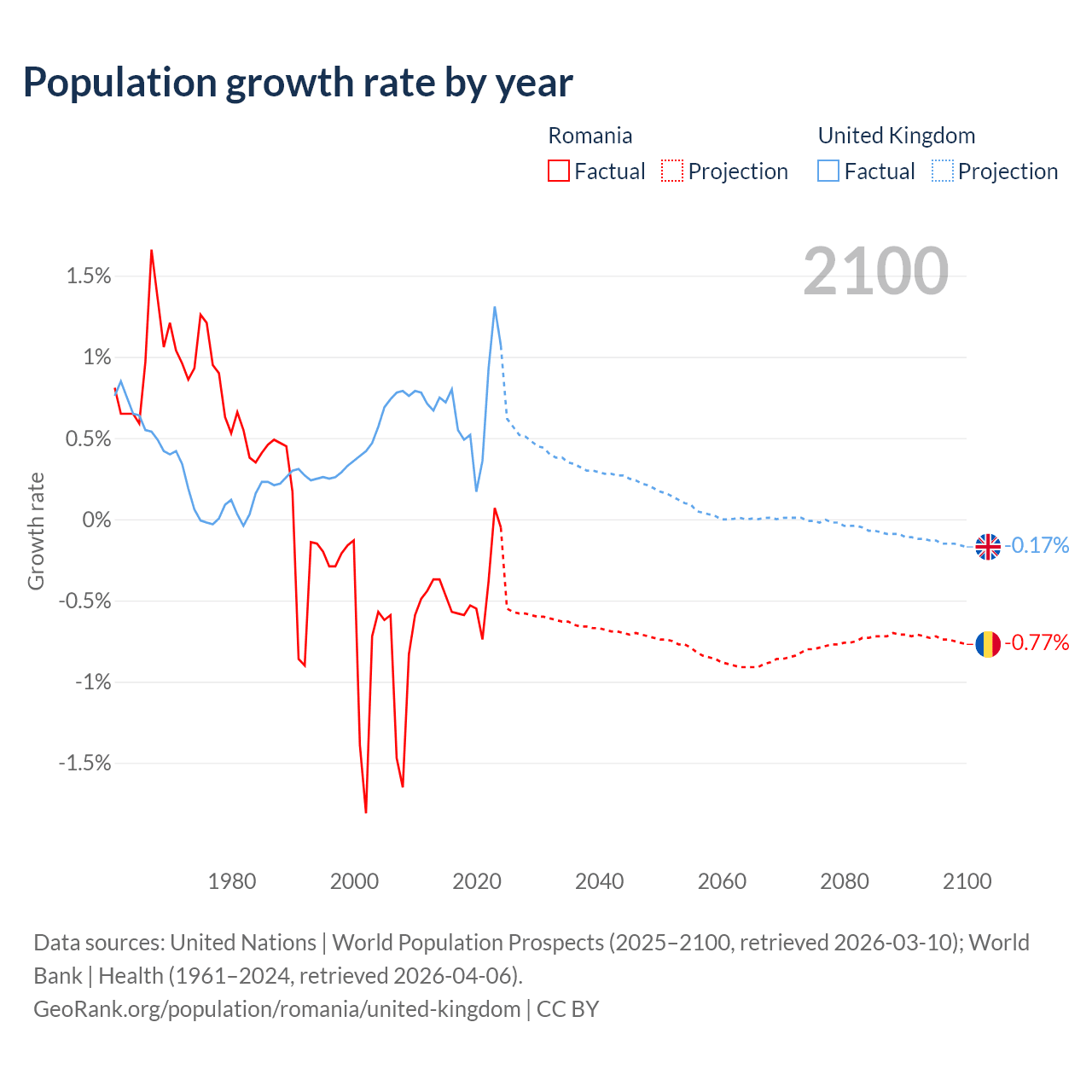 - For the last 10 years, Romania has had an average growth rate of -0.43% per year vs +0.7% in the United Kingdom.