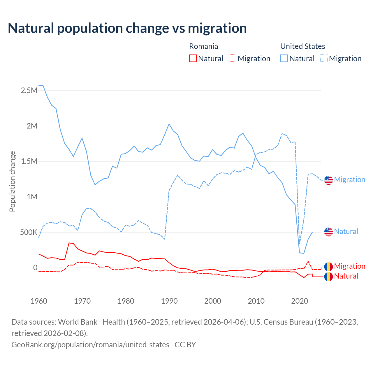Over the last 10 years, 82% of the population change in Romania is from natural causes (a loss of 766,295 people) and 18% is from migration (a loss of 167,917 people). In the United States 35.8% is from natural causes (a gain of 8,005,866 people) and 64.2% is from migration (a gain of 14,334,286 people).