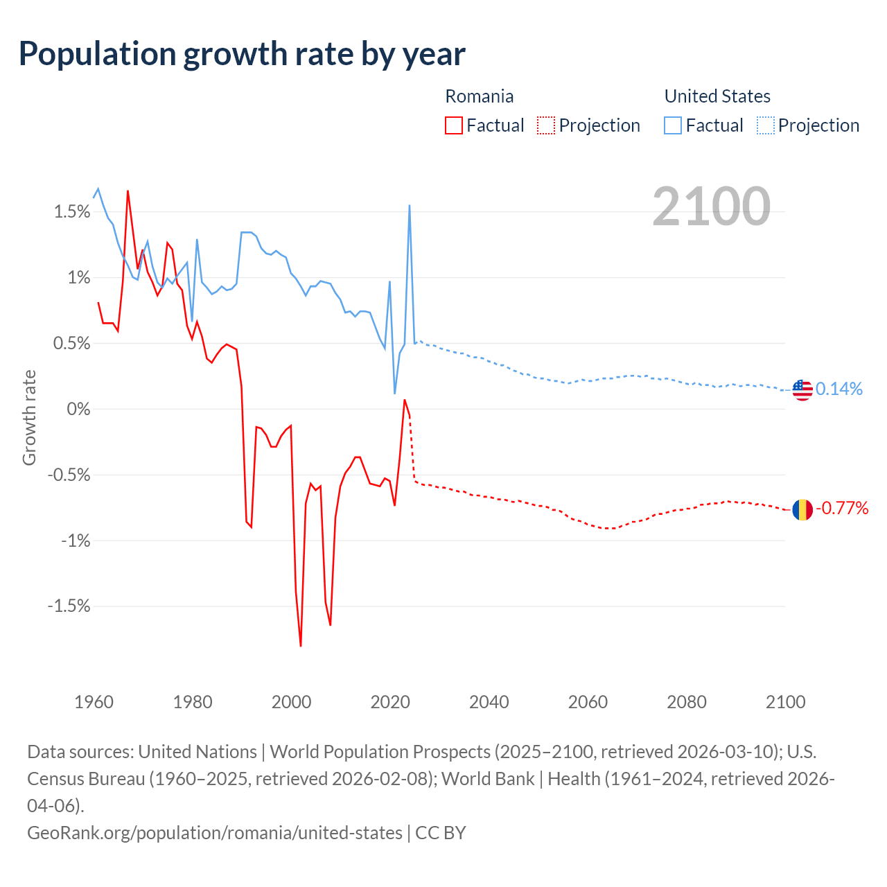 Data sources: World Bank | Health (1960–2024, retrieved 2026-04-06); United Nations | World Population Prospects (1960–2026, retrieved 2026-03-10); U.S. Census Bureau (1960–2025, retrieved 2026-02-08); Central Intelligence Agency (CIA) (2000–2019, retrieved 2026-02-20).