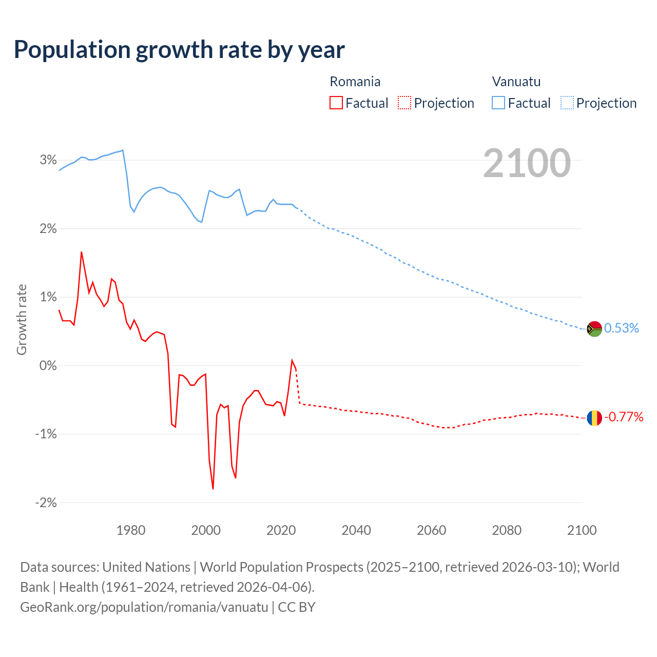- For the last 10 years, Romania has had an average growth rate of -0.43% per year vs +2.33% in Vanuatu.