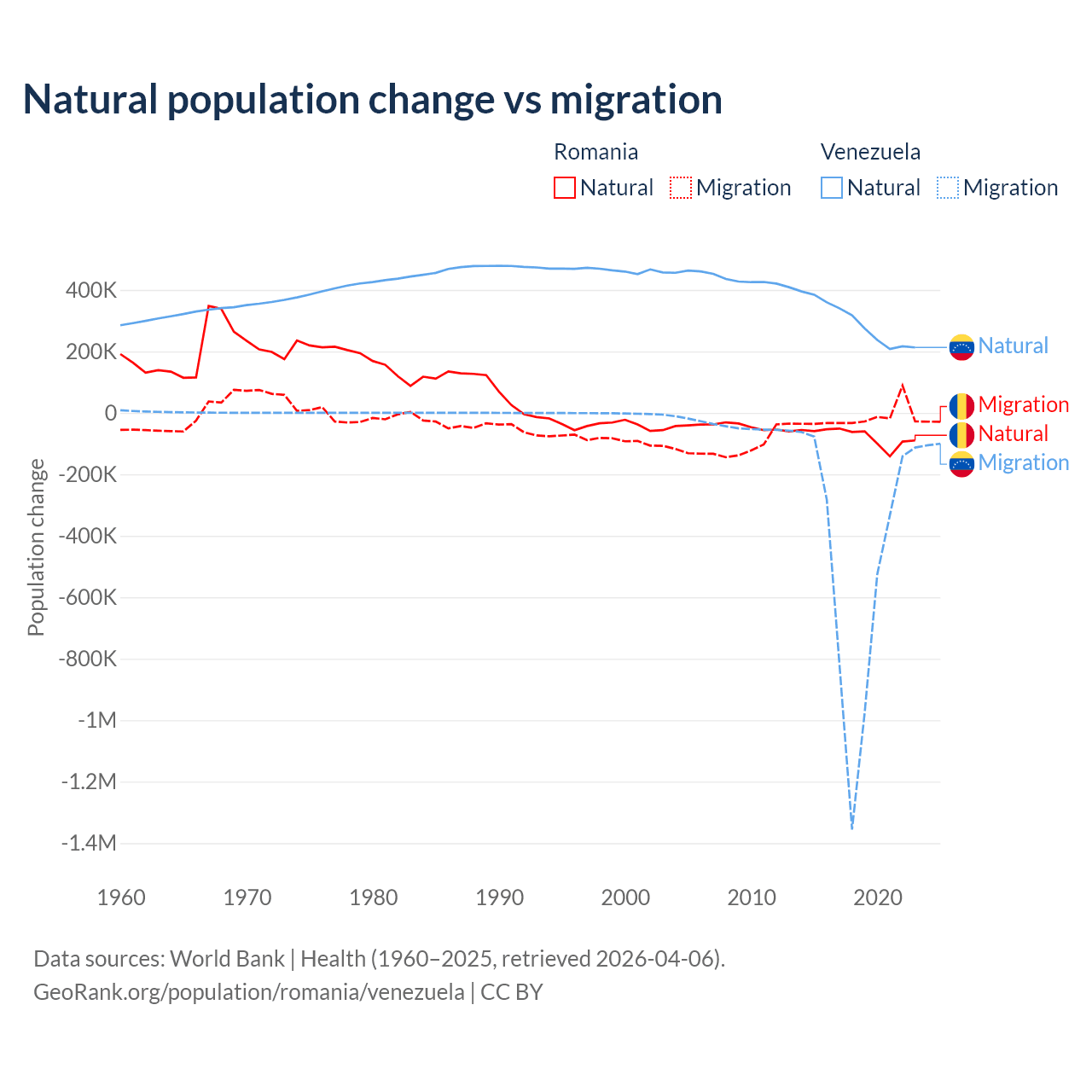 Over the last 10 years, 82% of the population change in Romania is from natural causes (a loss of 766,295 people) and 18% is from migration (a loss of 167,917 people). In Venezuela 38.6% is from natural causes (a gain of 2,946,257 people) and 61.4% is from migration (a loss of 4,683,227 people).