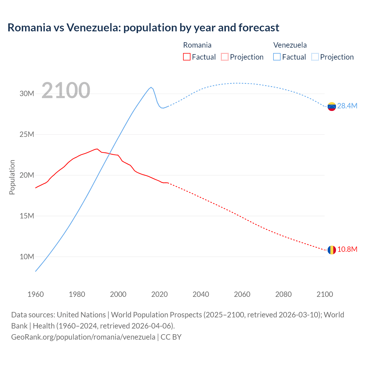 The latest officially reported population of Romania was 19,051,804 in 2024 vs 28,405,543 people in Venezuela in 2024. In 2026, based on the adjusted UN estimation, the current Romania's population is 18,839,108 people compared to 28,661,242 in Venezuela.