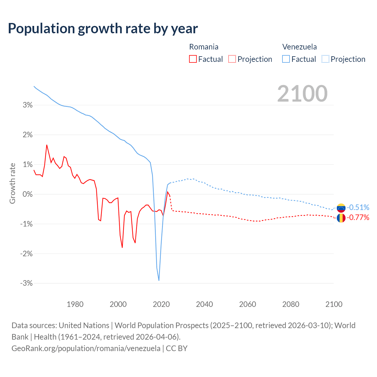 - For the last 10 years, Romania has had an average growth rate of -0.43% per year vs -0.46% in Venezuela.