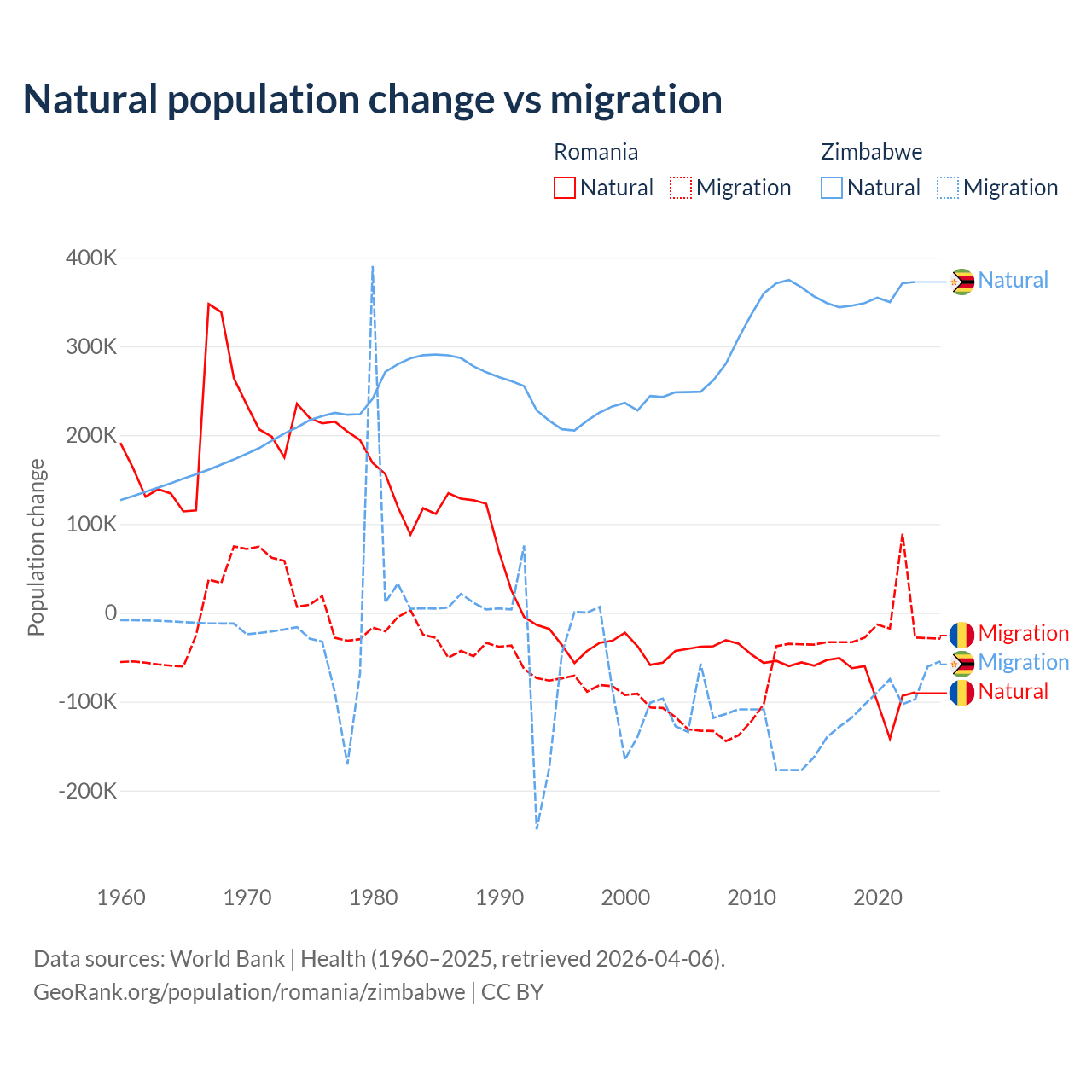 Over the last 10 years, 82% of the population change in Romania is from natural causes (a loss of 766,295 people) and 18% is from migration (a loss of 167,917 people). In Zimbabwe 74.9% is from natural causes (a gain of 3,558,487 people) and 25.1% is from migration (a loss of 1,192,807 people).