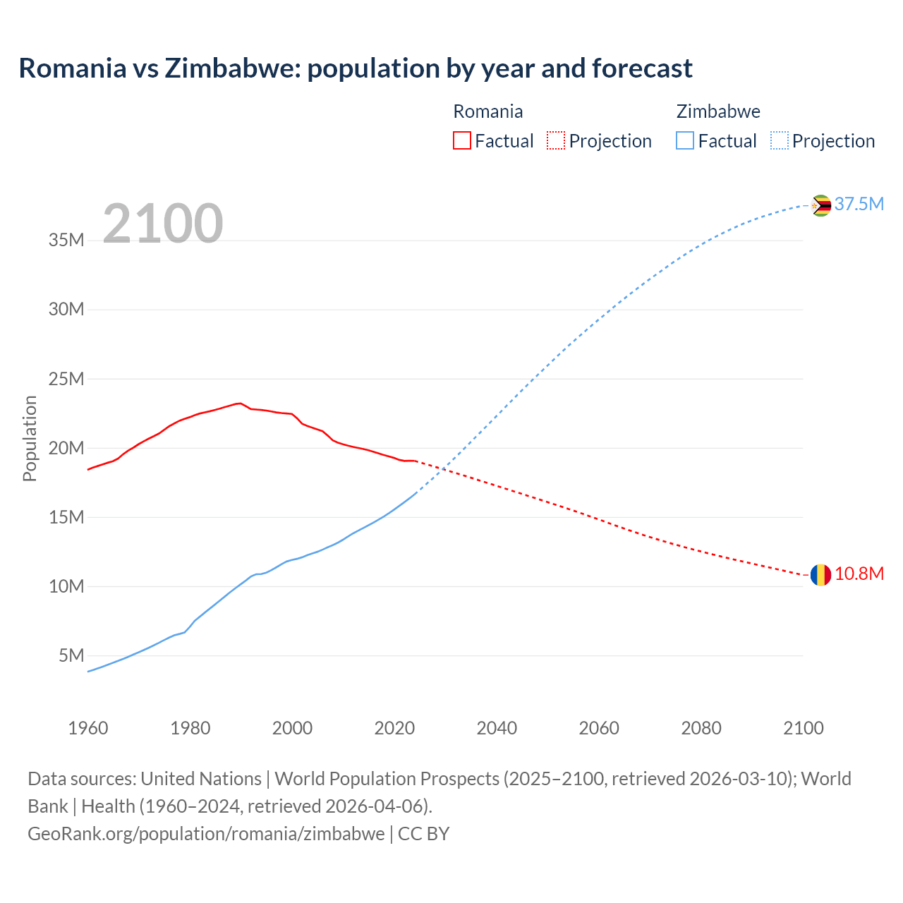 The latest officially reported population of Romania was 19,051,804 in 2024 vs 16,634,373 people in Zimbabwe in 2024. In 2026, based on the adjusted UN estimation, the current Romania's population is 18,839,108 people compared to 17,361,868 in Zimbabwe.