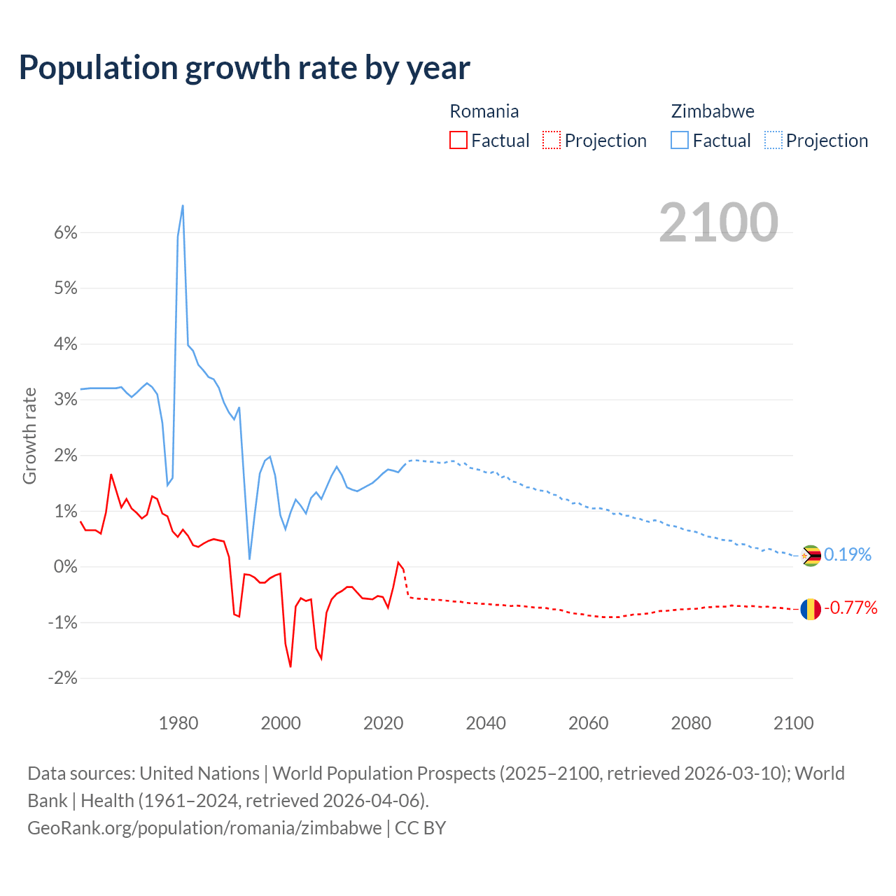 - For the last 10 years, Romania has had an average growth rate of -0.43% per year vs +1.57% in Zimbabwe.