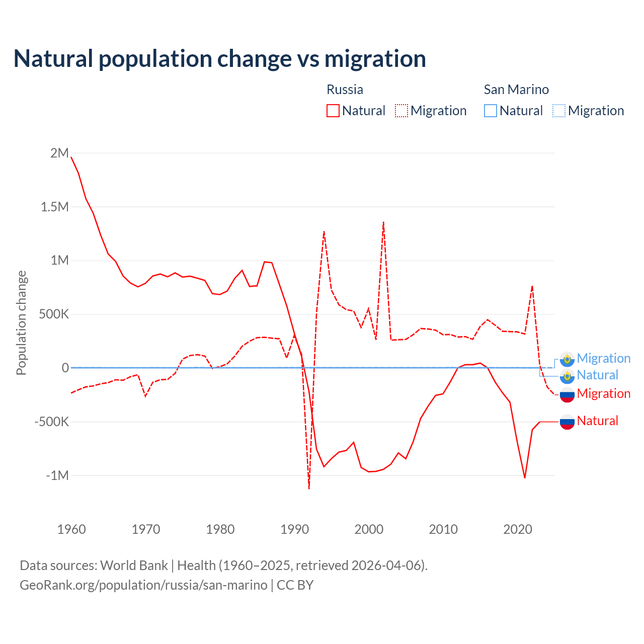 Over the last 10 years, 48.6% of the population change in Russia is from natural causes (a loss of 3,416,377 people) and 51.4% is from migration (a gain of 3,611,826 people). In San Marino 40.9% is from natural causes (a loss of 358 people) and 59.1% is from migration (a gain of 517 people).
